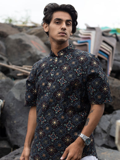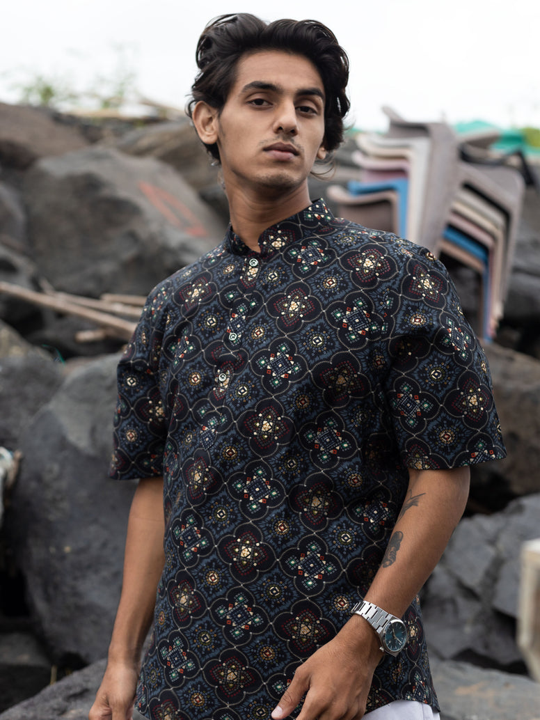 Black Modern Printed Men's Shirt Kurta: Casual Festive Trend