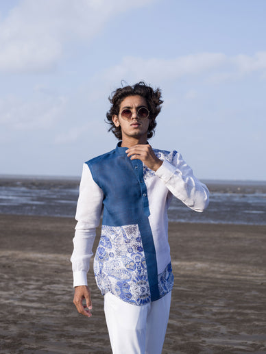 Stylish men's fusion shirt in blue & white with ethnic prints—perfect for beach outings or festive wear. Shop the look today!