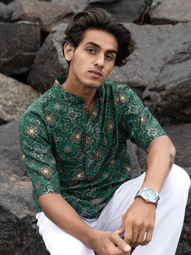 Green Modern Printed Men's Shirt Kurta: Casual Festive Trend