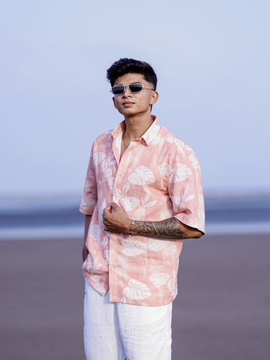 Elevate your summer style with this men’s peach linen shirt featuring a soft tropical leaf print. Lightweight, breathable, and perfect for beach days, vacations, and casual outings.
