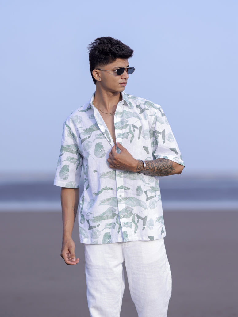 Men’s Tropical White & Green Leaf Print Linen Shirt