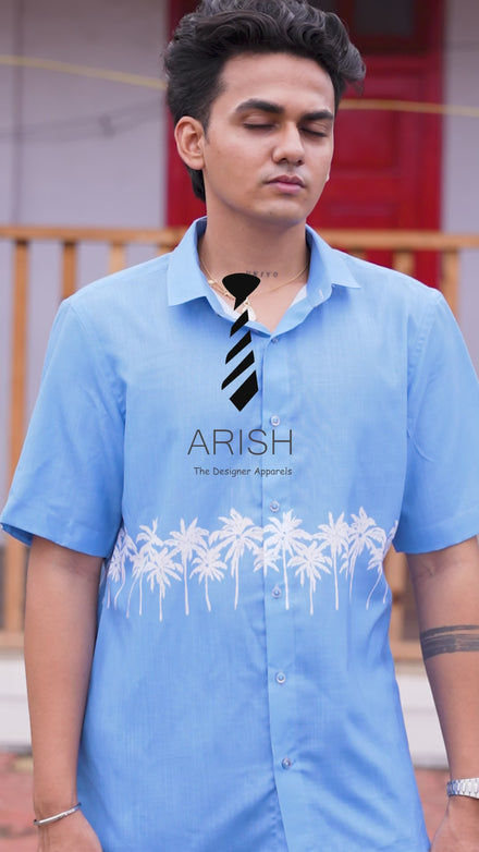 Street Wear Blue & White Palm Tree Print Cotton Linen Shirt