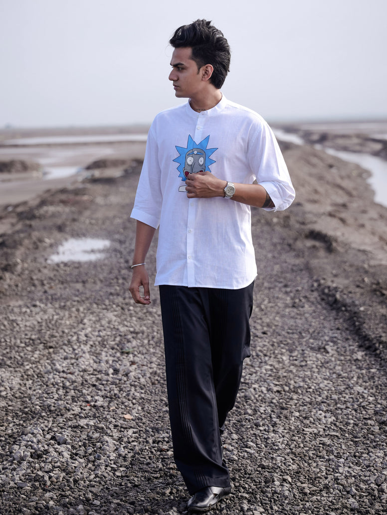 Step up your casual wardrobe with this white mandarin collar shirt featuring a bold graphic print design. Lightweight, breathable, and stylish — ideal for summer outfits, street style, and casual wear. Pair it with jeans or chinos for a cool, effortless look.