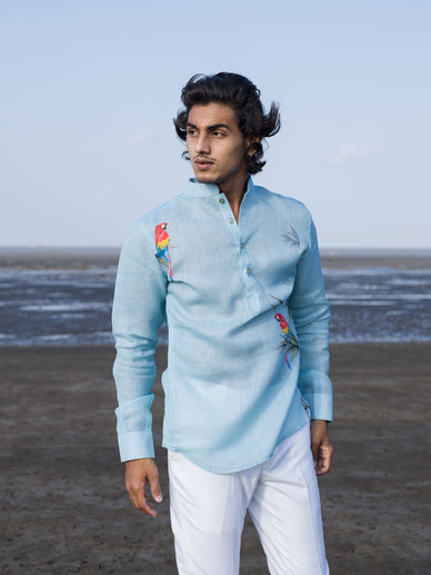 Elevate your summer style with this elegant sky blue linen shirt featuring tropical bird and palm motifs. Perfect for beachside events and festive occasions. Shop now for breezy comfort and refined fashion.