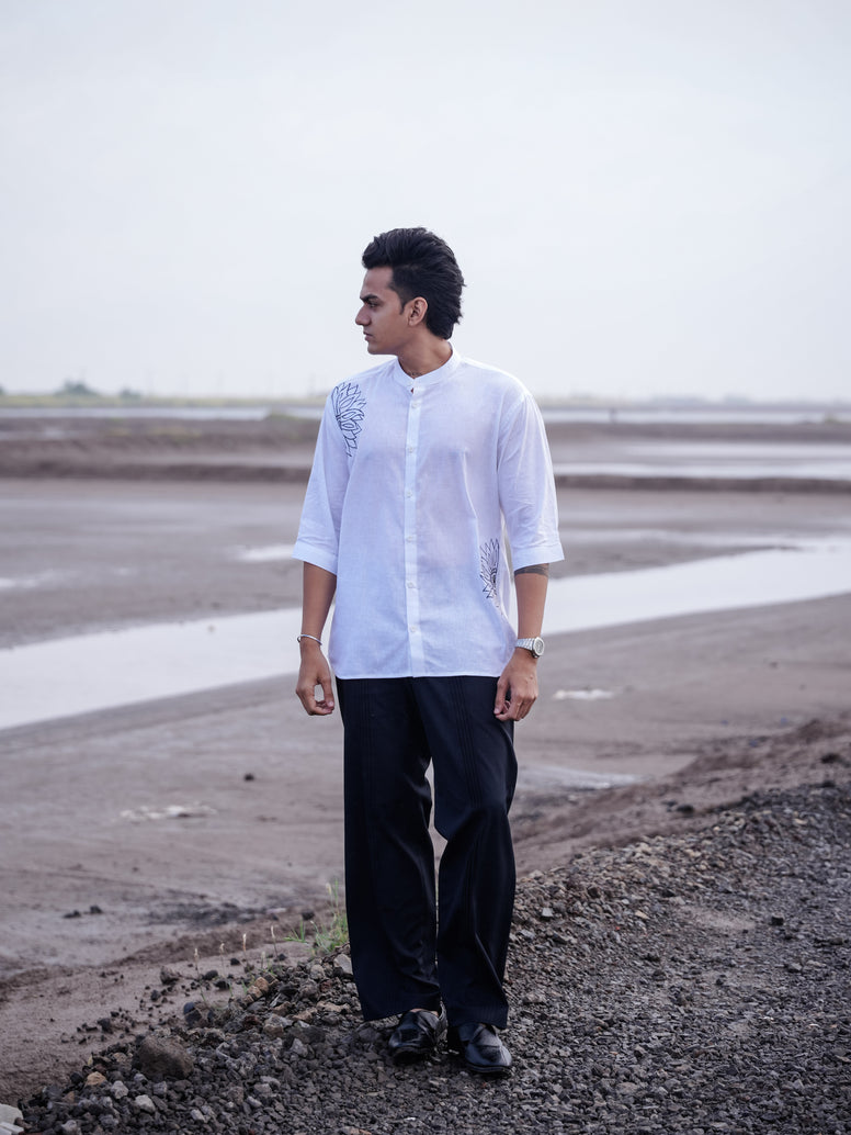This white mandarin collar shirt with artistic embroidery is a perfect blend of minimalism and modern men’s fashion. Pair it with black trousers for a chic casual or semi-formal outfit.